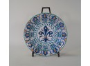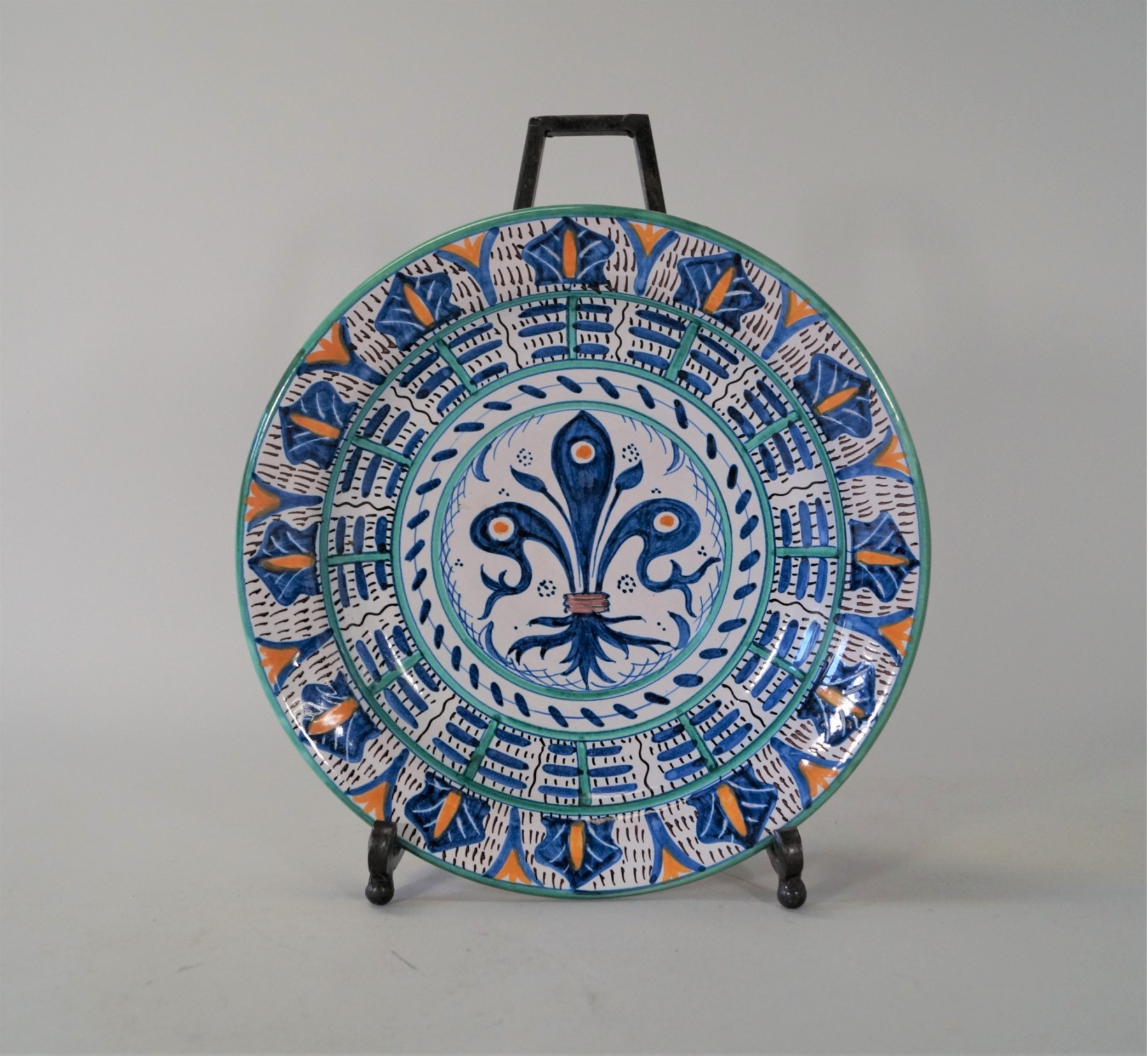 Listed is an unmarked faience bowl measuring 11" in diameter and 2.75"h. It is beautifully decorated with blue, orange and teal glaze on white with a central fleur de lis motif. In very good condition with no cracks, crazing or chips. Please see photos for details.