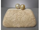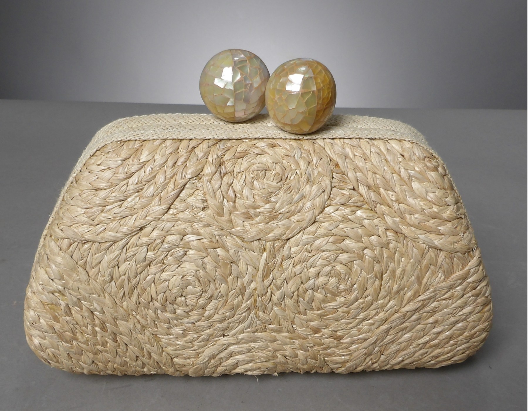 Pretty clutch with a swirl raffia design. 2 large crackle design buttons on top. Purse stays close by magnets. One side pocket on the inside.