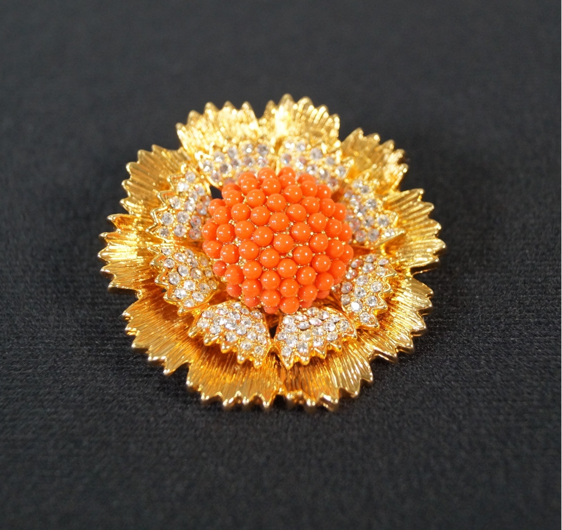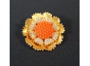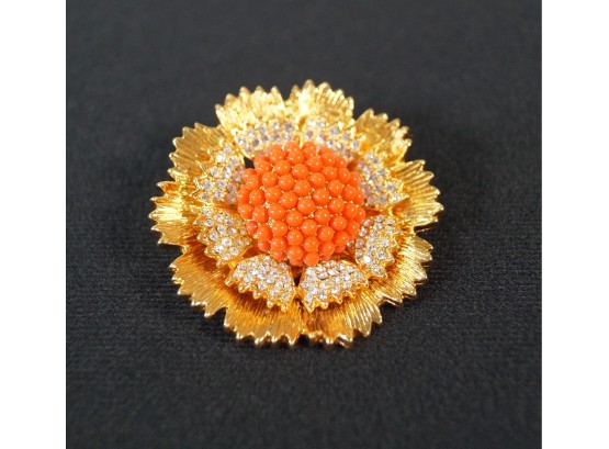Listed is a lovely flower brooch in gold tone metal featuring a faux coral bead center and glittering pave crystals. It measures just under 2" in diameter. It can also be worn as a pendant using the hook on the back.