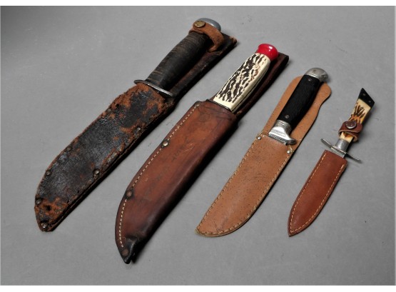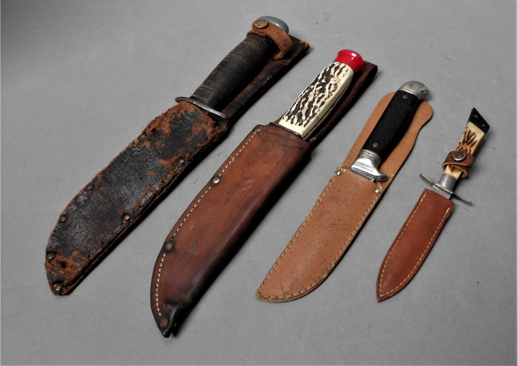 - Imperial Knife Co. 8" knife - tin-like black handle. Sheath is somewhat brittle. Overall condition is