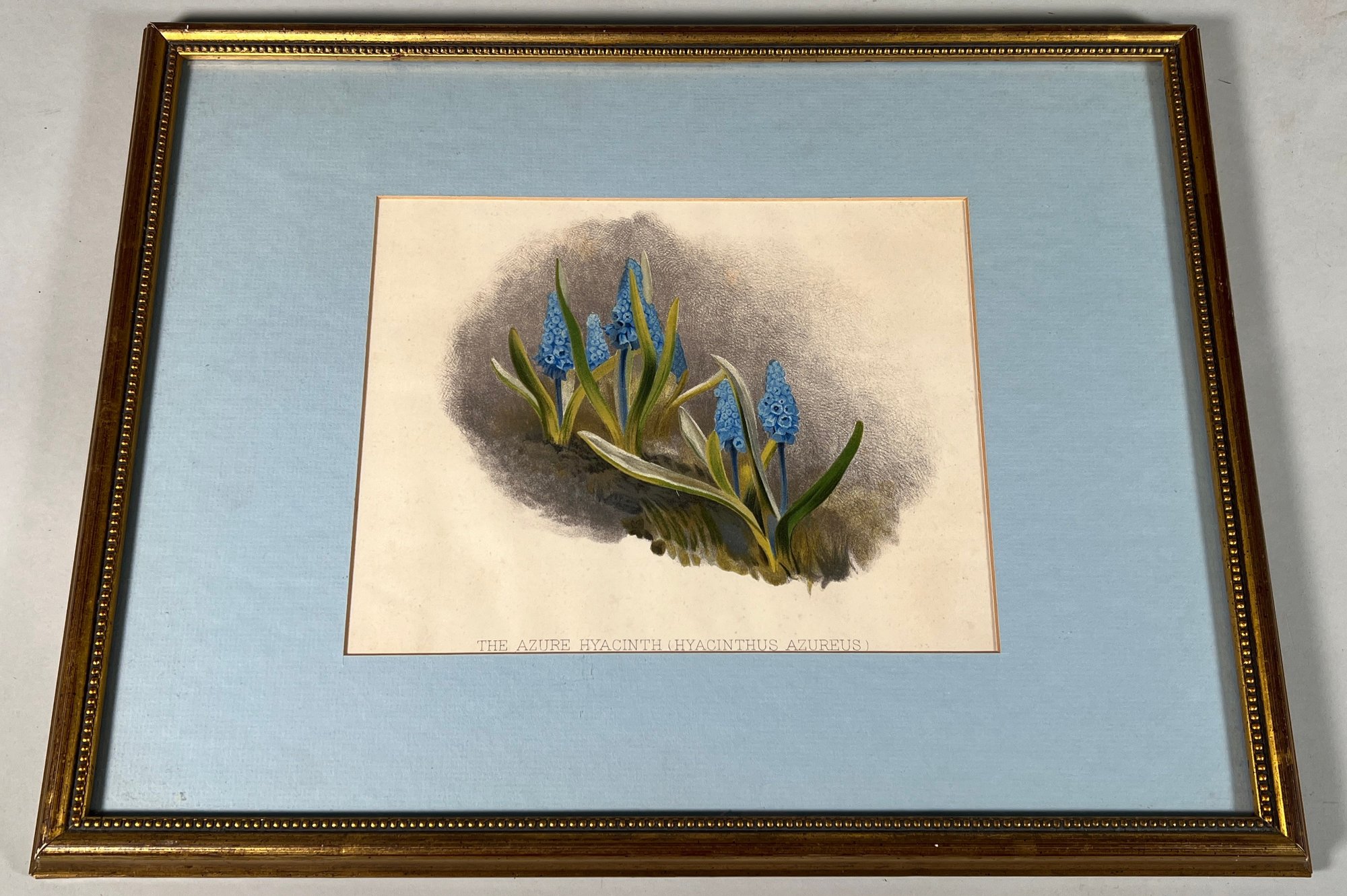Framed botanical print featuring the "Azure Hyacinth" with an additional view of the framed artwork's back and mounting.