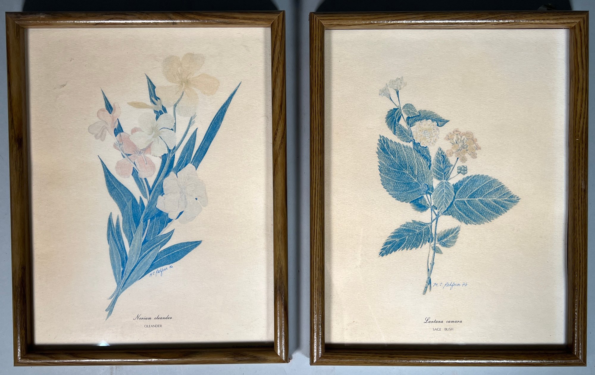 The first print displays a branch with detailed leaves and small flowers, rendered primarily in shades of blue, with soft touches of color in the flowers. The botanical name and additional text appear in the lower right corner of the print.