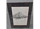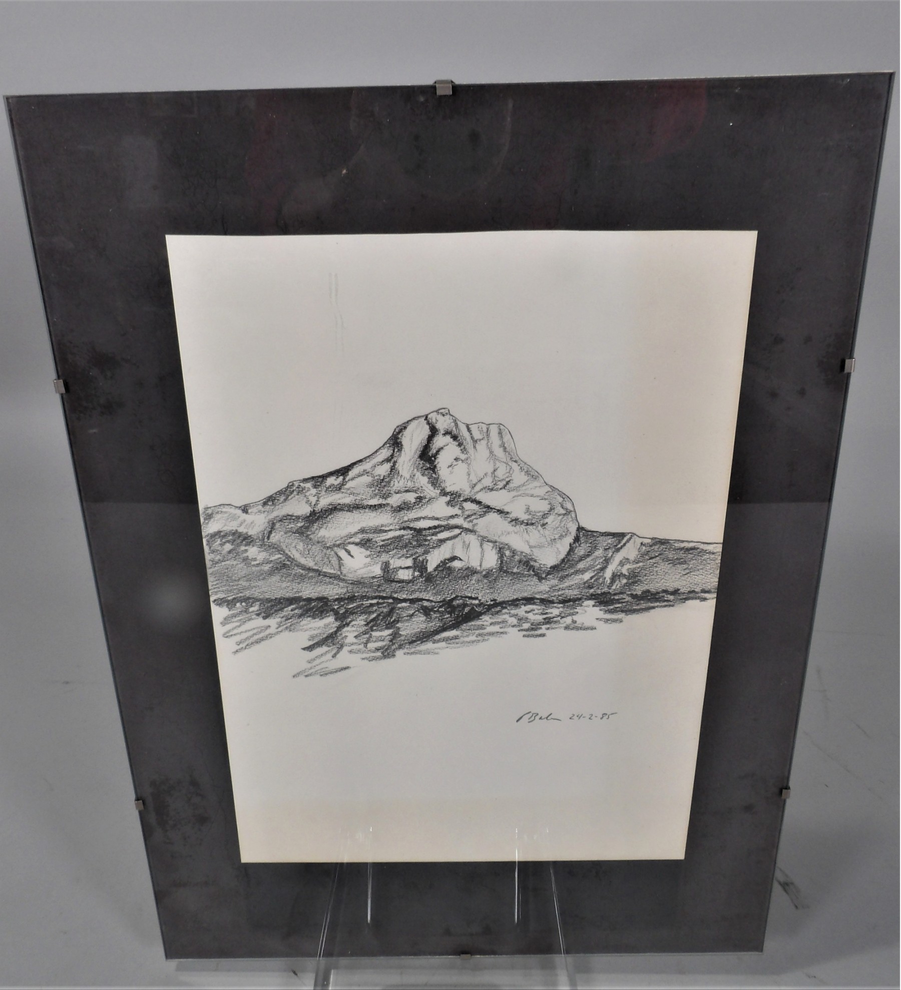 Listed is a charcoal rendering of a mountain. The work itself measures 8.25" x 11".