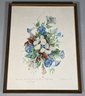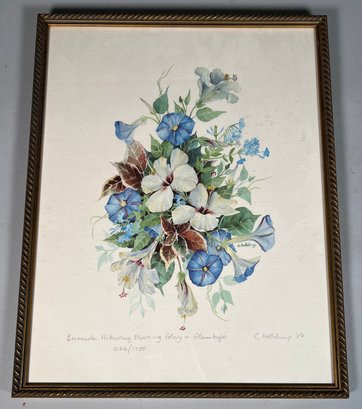 A limited edition botanical print of Bermuda Hibiscus, Morning Glory, and Plumbago, numbered 1064/1750, signed by the artist C. Holdship, dated 1986, in a decorative gold-tone frame.