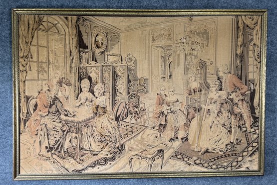 Framed textile art depicting a gathering of people in a formal interior. Dimensions: 36 x 53 inches.
