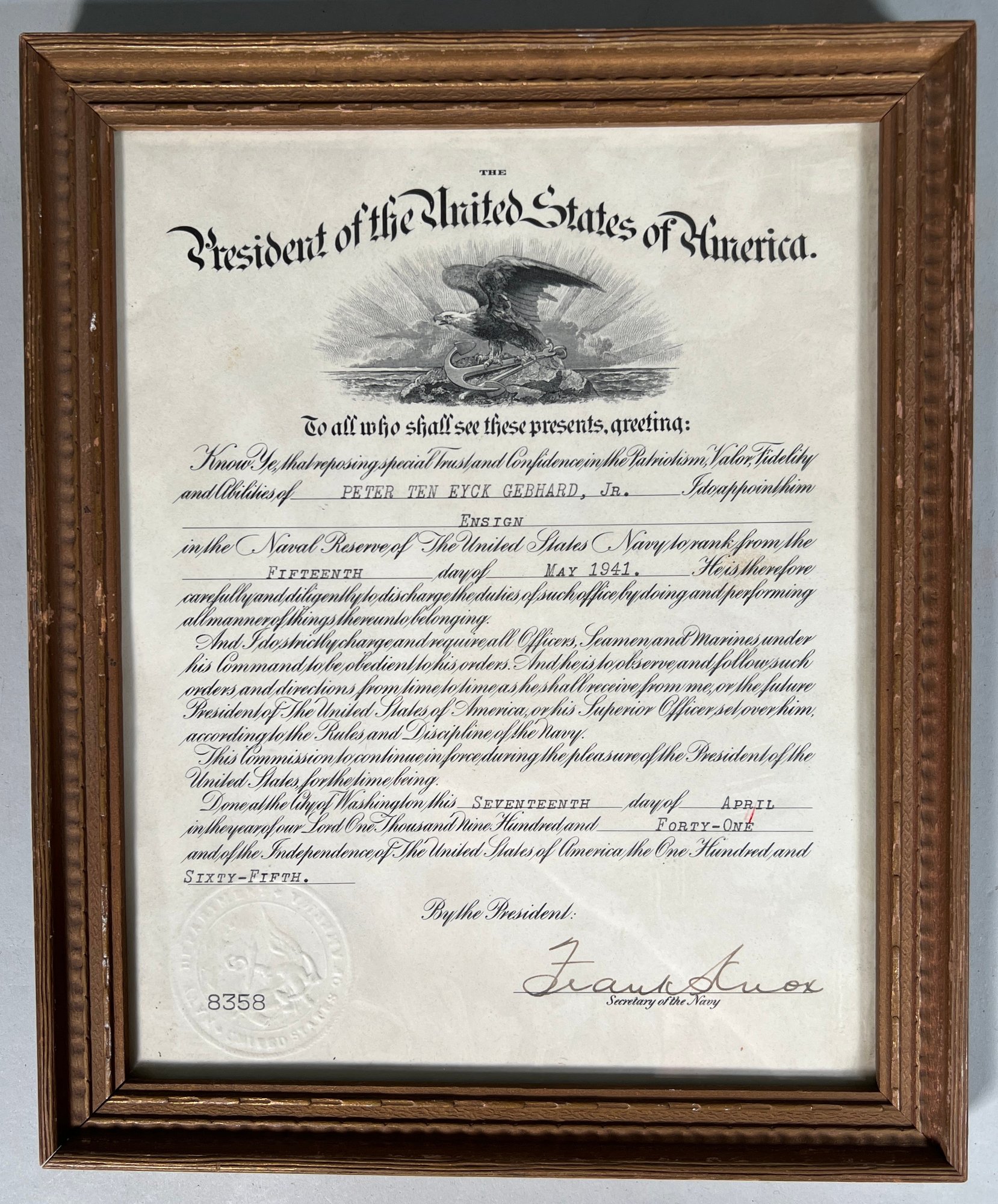 A framed commission certificate for Peter Ten Eyck Gebhard Jr., dated May 15, 1941, appointing him as an Ensign in the Naval Reserve of the United States Navy, signed by the Secretary of the Navy, Frank Knox.