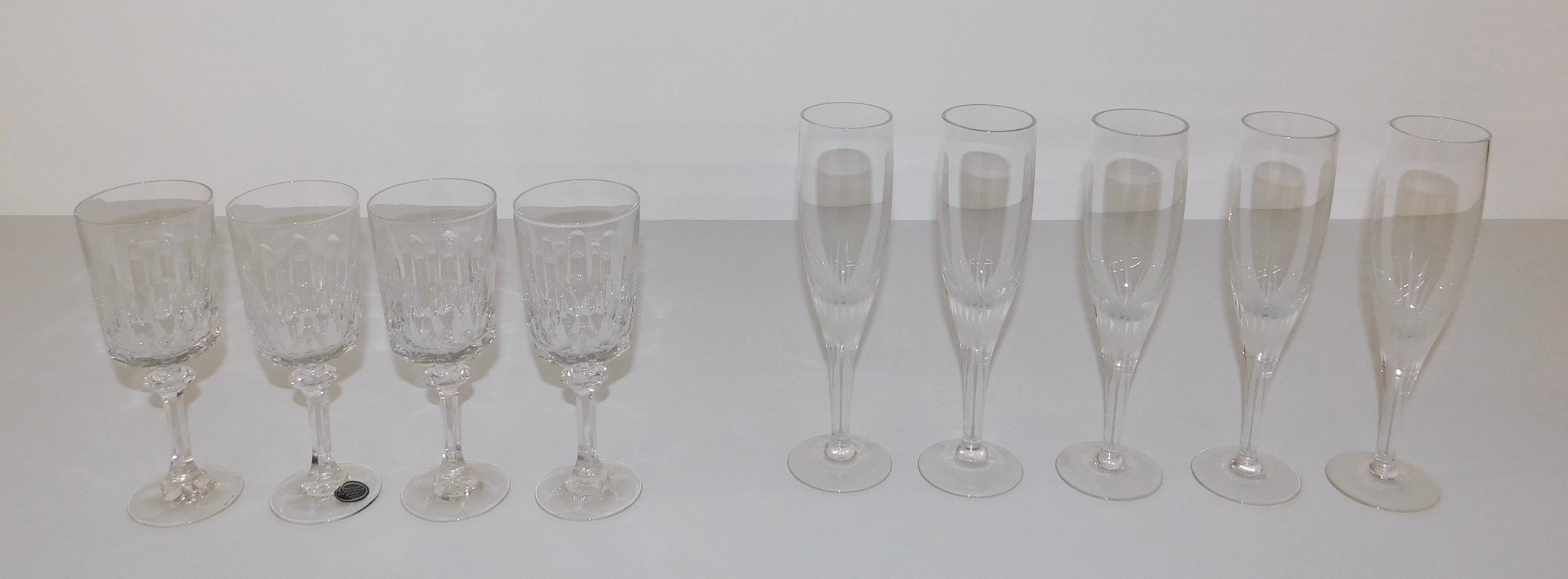 This is a mixed set of Franciscan Masterpiece Crystal glassware, including 4 goblets and 5 champagne flutes.