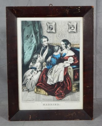 Charming 19th century hand painted lithograph of a young family with kids.