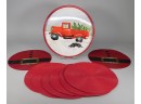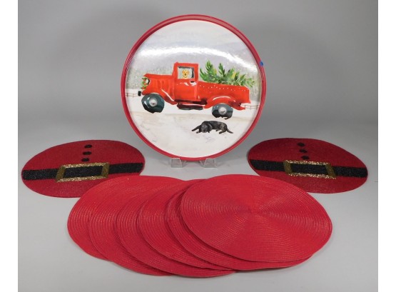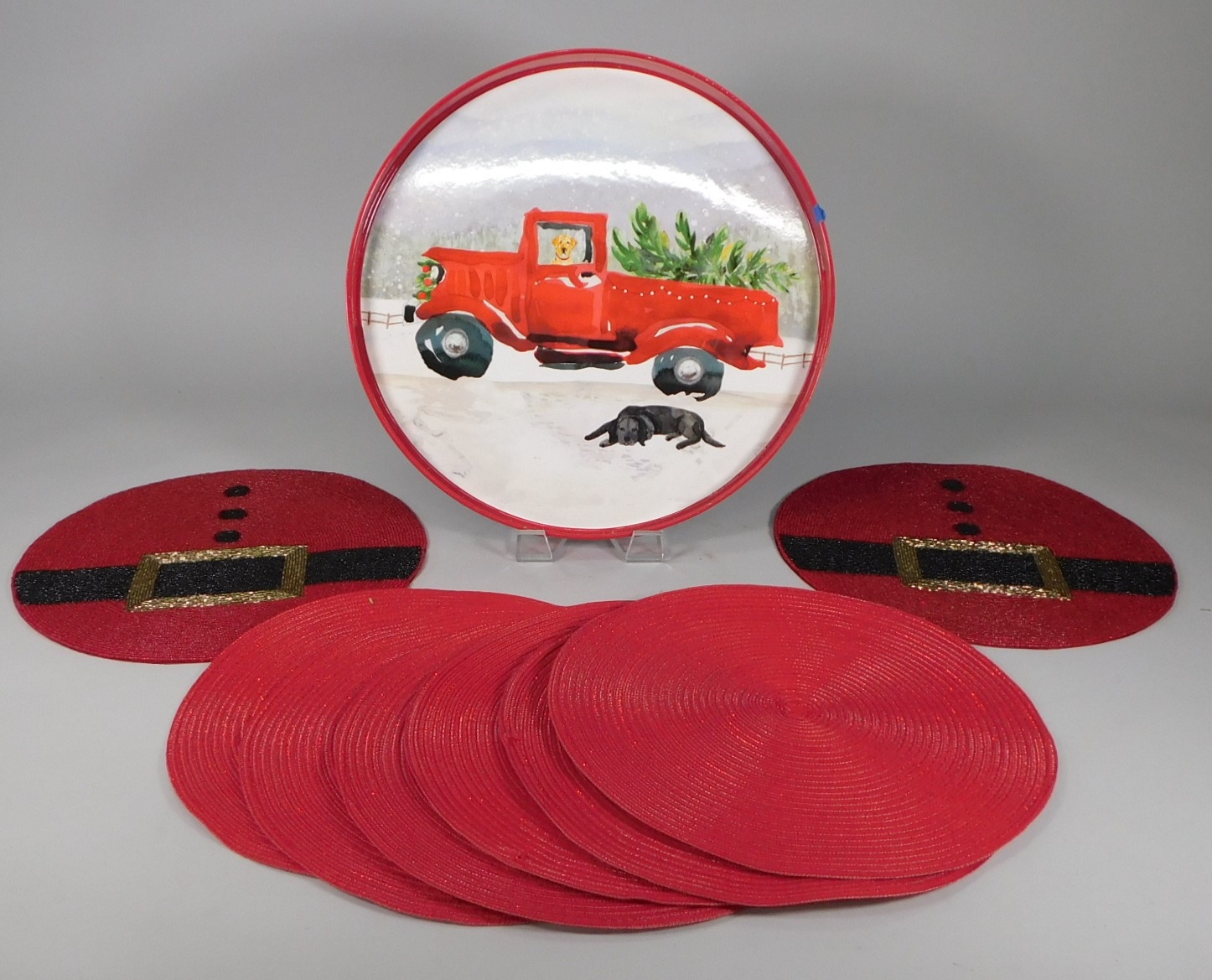 Tray is 18" round. Made by rockpaperscissors. Decorative use only. 2 Santa placemats are by Nicole Miller. 15" round. Also, 6 round, red placemats.