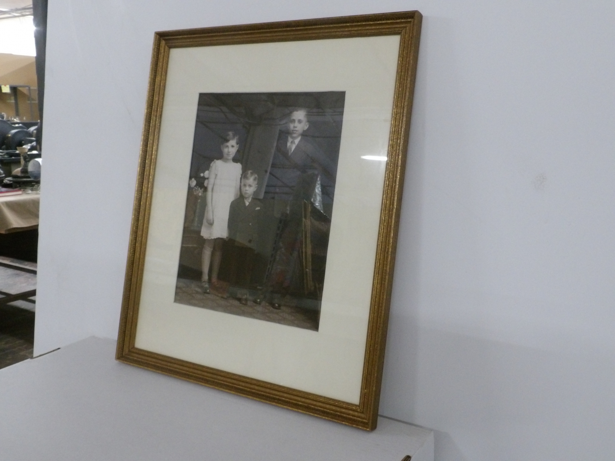 Listed is a framed photograph of 3 children - probably from the 1940's. It measures 18" x 21.5" with the frame and 13" x 10" without. The frame is beautiful - ornate gold tone. Condition is very good. See photos for details.