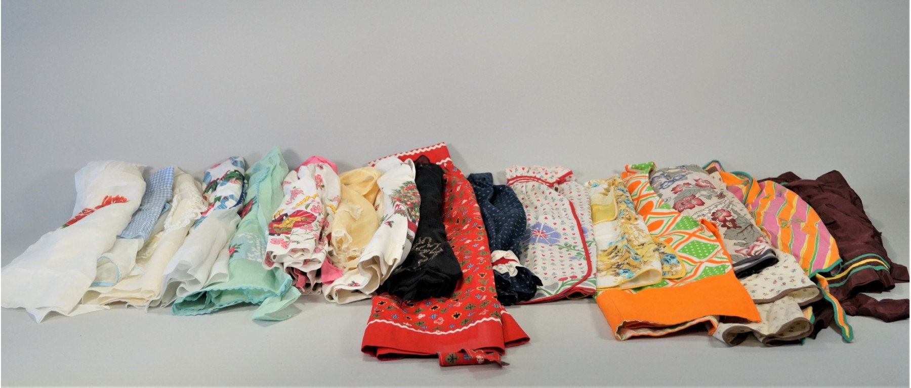 Listed are 18 vintage aprons, mostly from the early 1960's, some from the '70's. Mostly cotton, some cotton voile. All are in very good condition (some appear unused), but a few have some minor stains. Most are hand made. Please see photos for details.