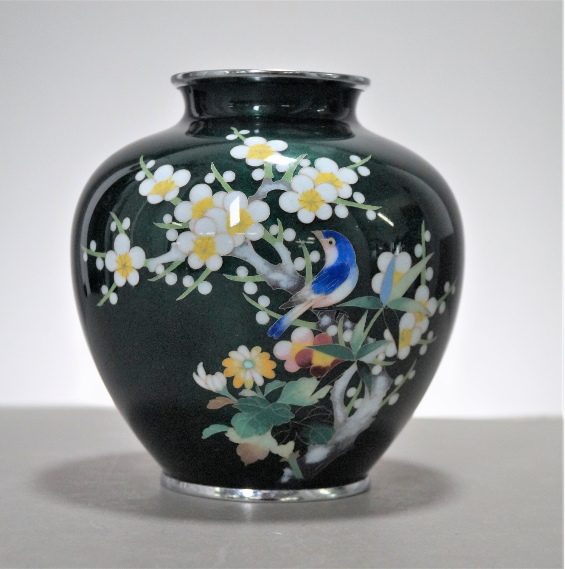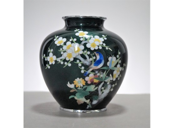 Listed is a lovely Japanese enamel vase featuring an apple blossom tree, flowers and a blue bird on a lustrous deep green background. There is a ding and a scratch on one side, otherwise it is in very good condition. Please see photos for details. Measures 6.5" tall.