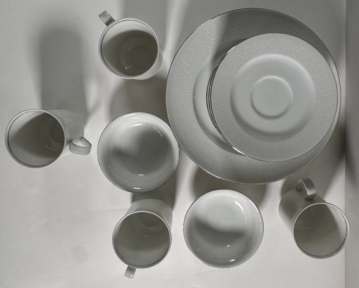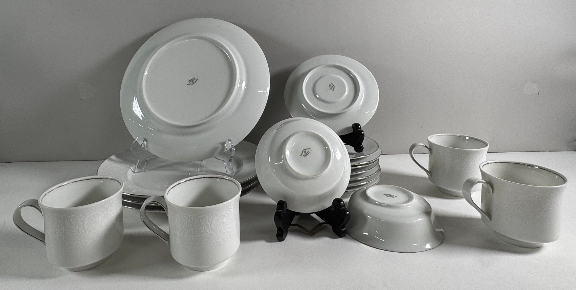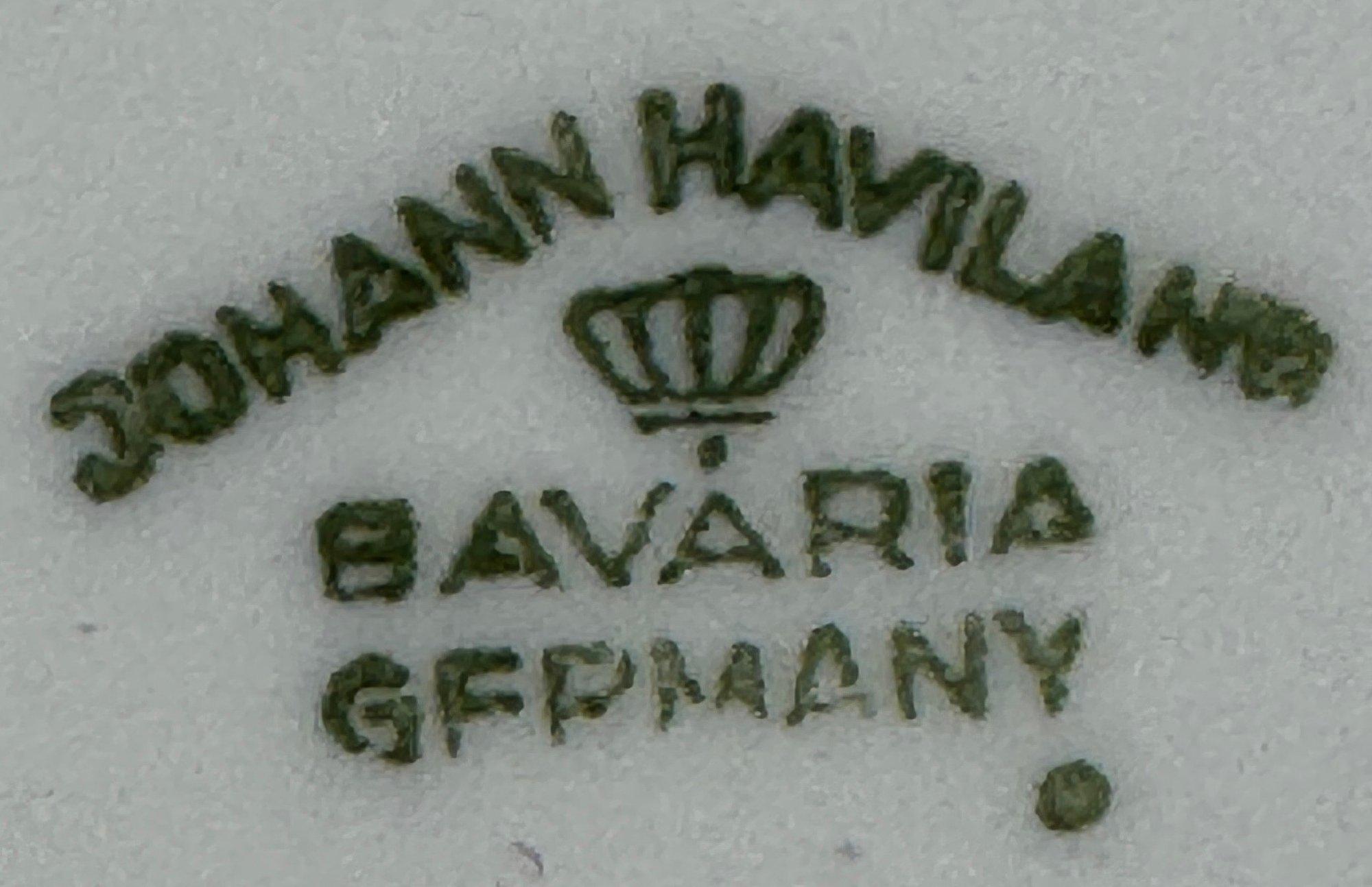 Johann Haviland Bavaria Germany porcelain set. Includes plates, bowls, saucers, and mugs. Largest plate measures approximately 12.5 inches. Mugs measure approximately 3.25 x 3.25 inches.