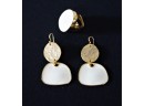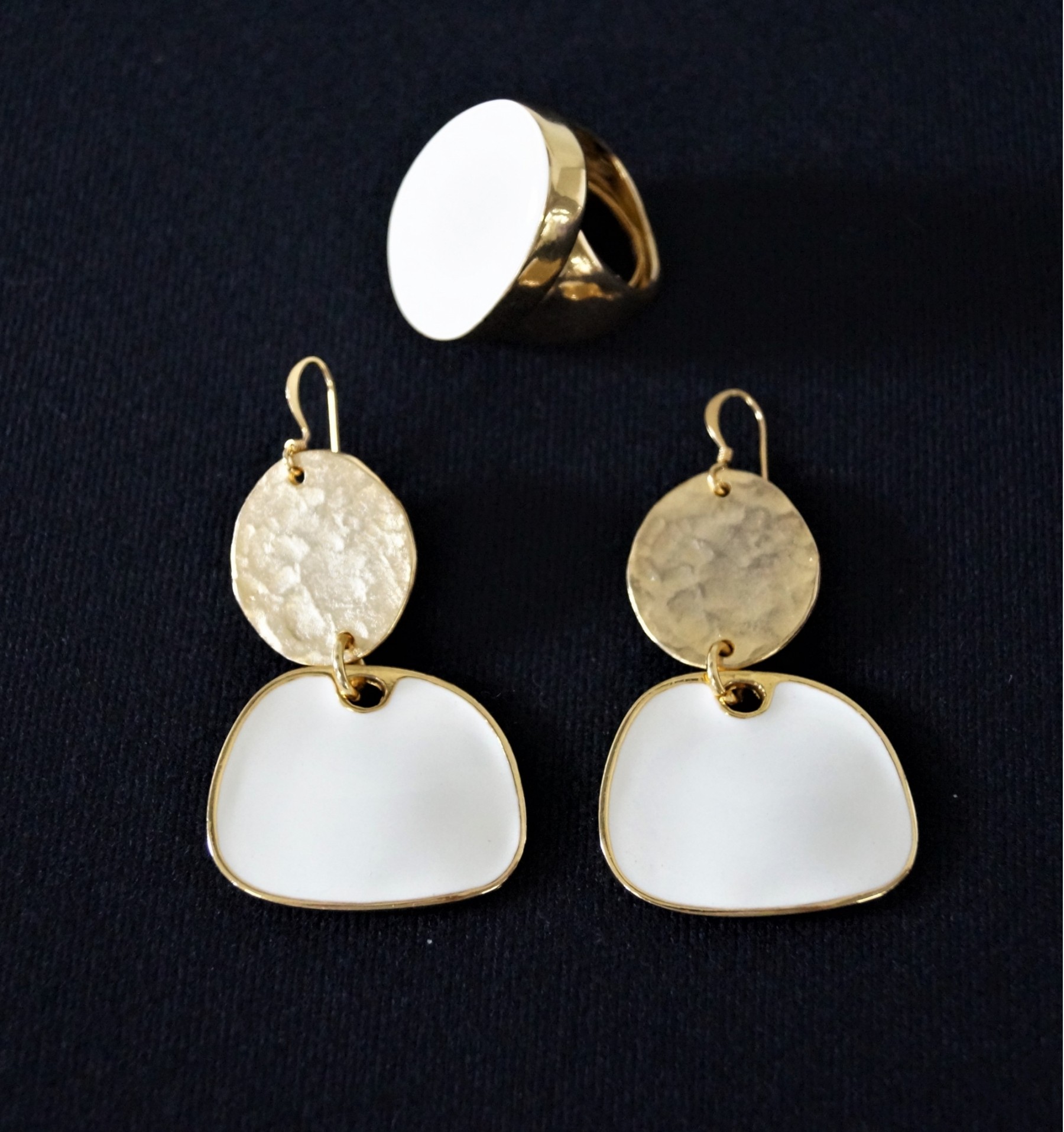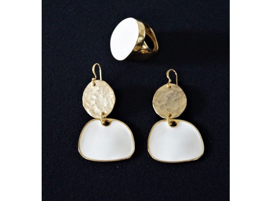 Listed is a large enamel statement ring and pierced earring set by Kenneth Lane featuring cream colored enamel on gold tone metal. The earrings measure 2" in length and the ring face is 1.25" in length. The ring measure size 7.5 but there is an interior spring that allows for some adjustment. In very good, unworn condition. Please see photos for details.
