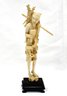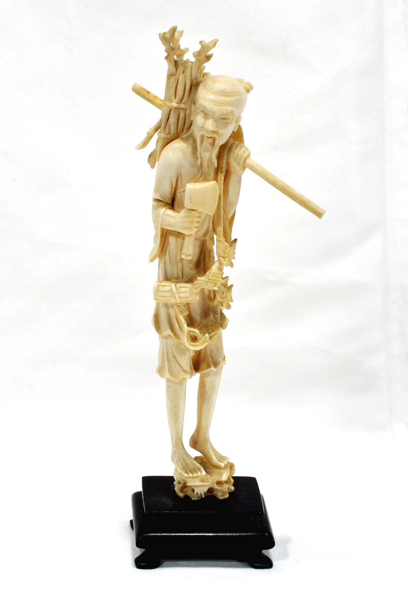 Hand carved and very detailed figure of man with axe and fish, carrying tree branches.