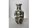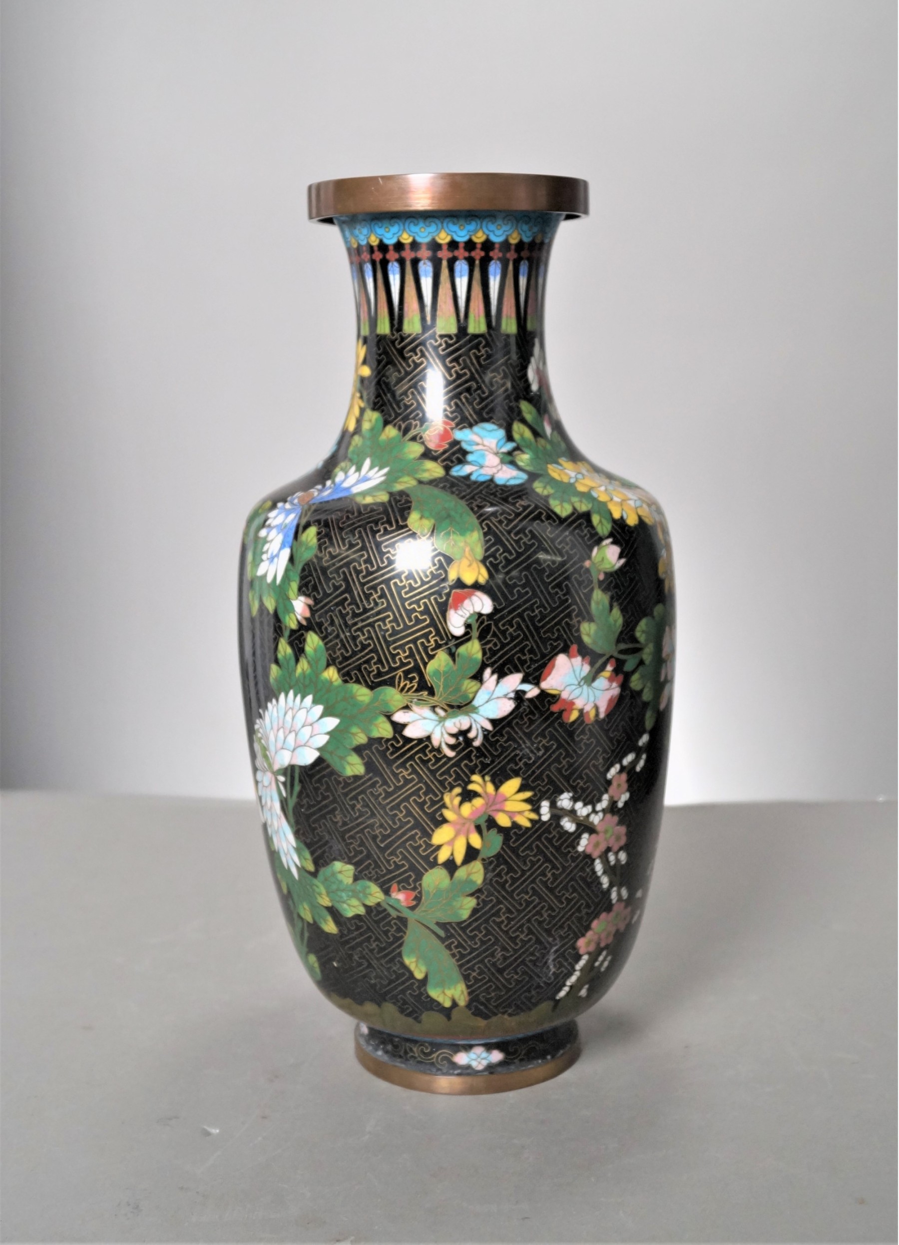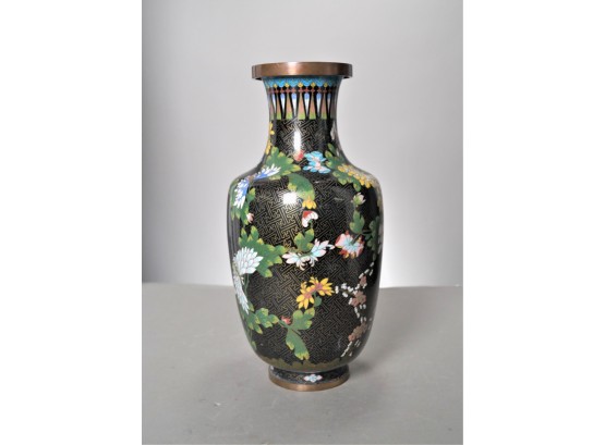 Listed is a beautiful 15" tall cloisonne vase featuring a black background and a meandering floral motif. In overall good condition, but there is a slight dent along the shoulder and a small and bigger one at the base, still a very pretty piece. Please see photos for details.