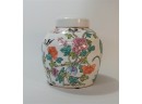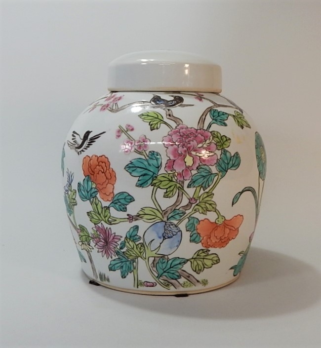Listed is a large ginger jar beautifully hand decorated with chrysanthemums, peonies, birds and branches of dogwood. It measures about 8" across at the widest point x 9.5" high. In very good condition with no chips or cracks. See photos for details.
