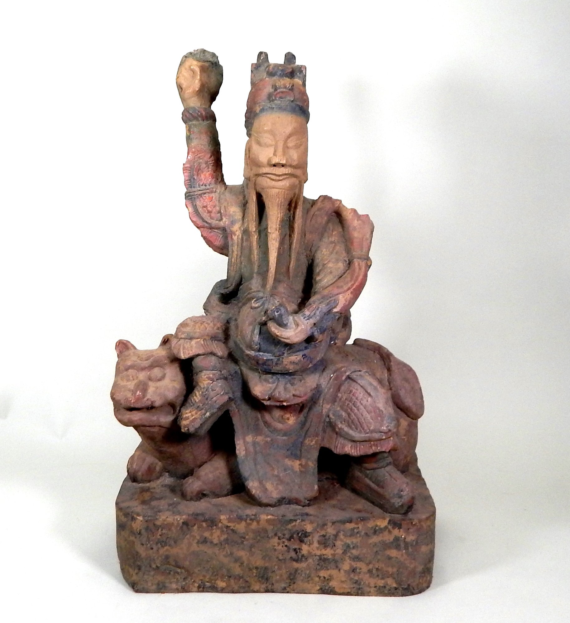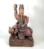 Large resin figure of old man sitting on the dog or lion holding a bird in his hand.