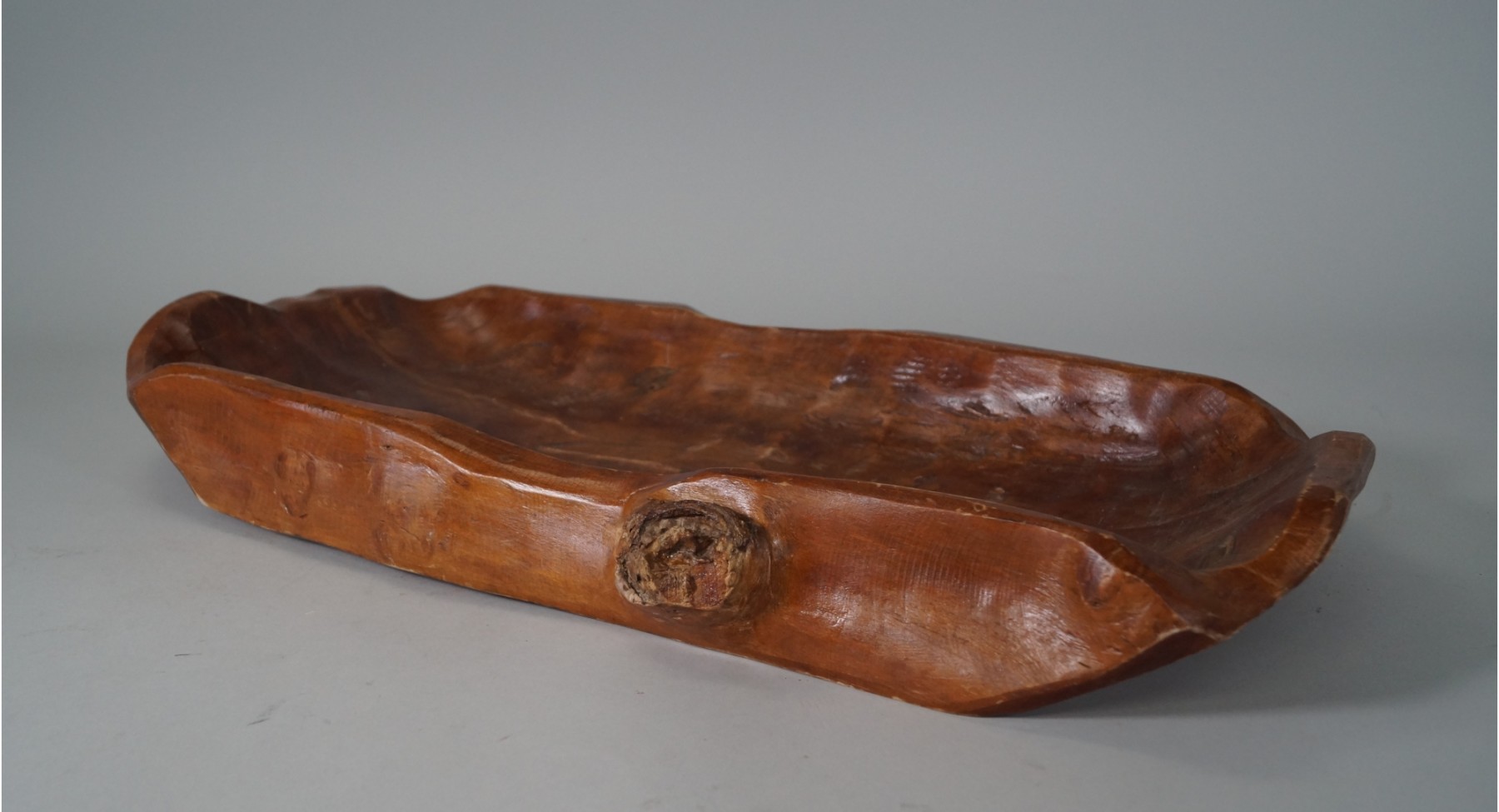 Listed is a large, very rustic carved bowl featuring intentional wood knots and roughness. It measures 27"l x 12.25"w. Sticker on back "Made in Philippines." In good used condition. See photos.
