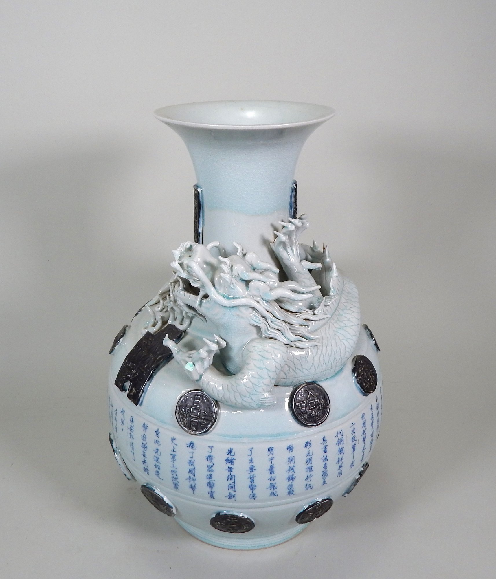 Large and heavy vase with inscription and applied figure of dragon.