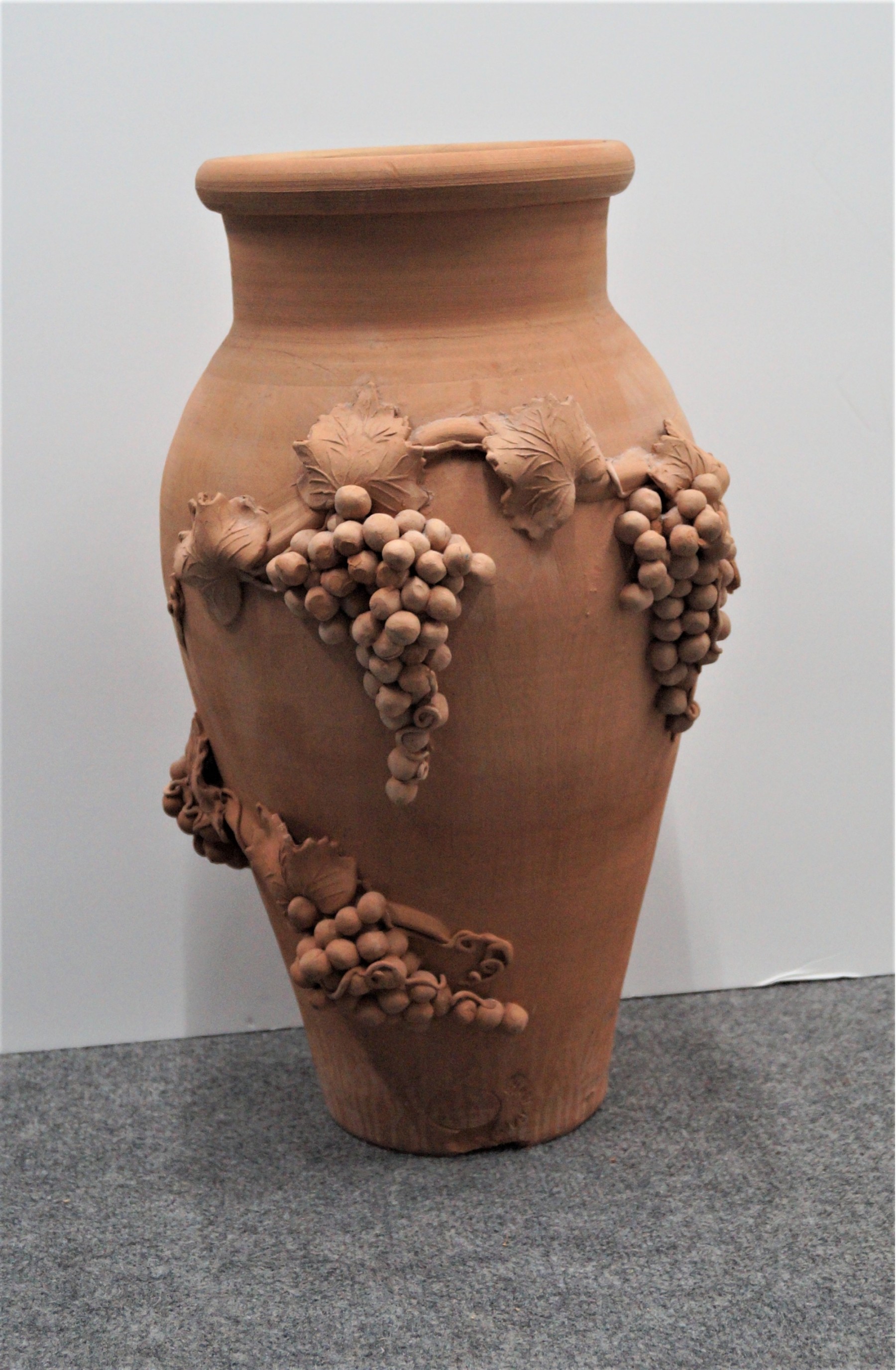 Listed is a terracotta vase - 21"h x 8.5"diameter at opening decorated with grape bunches. Made in Italy. There is a small chip on the base. Condition is very good. See photos for details.