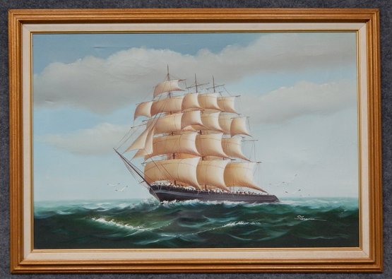 Beautiful original oil painting on canvas of clipper ship with sails.