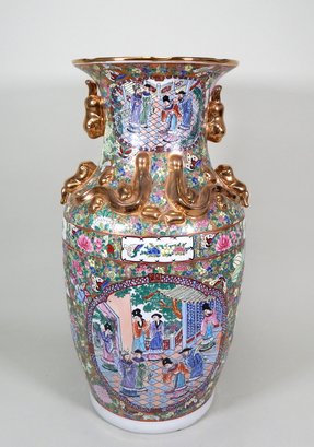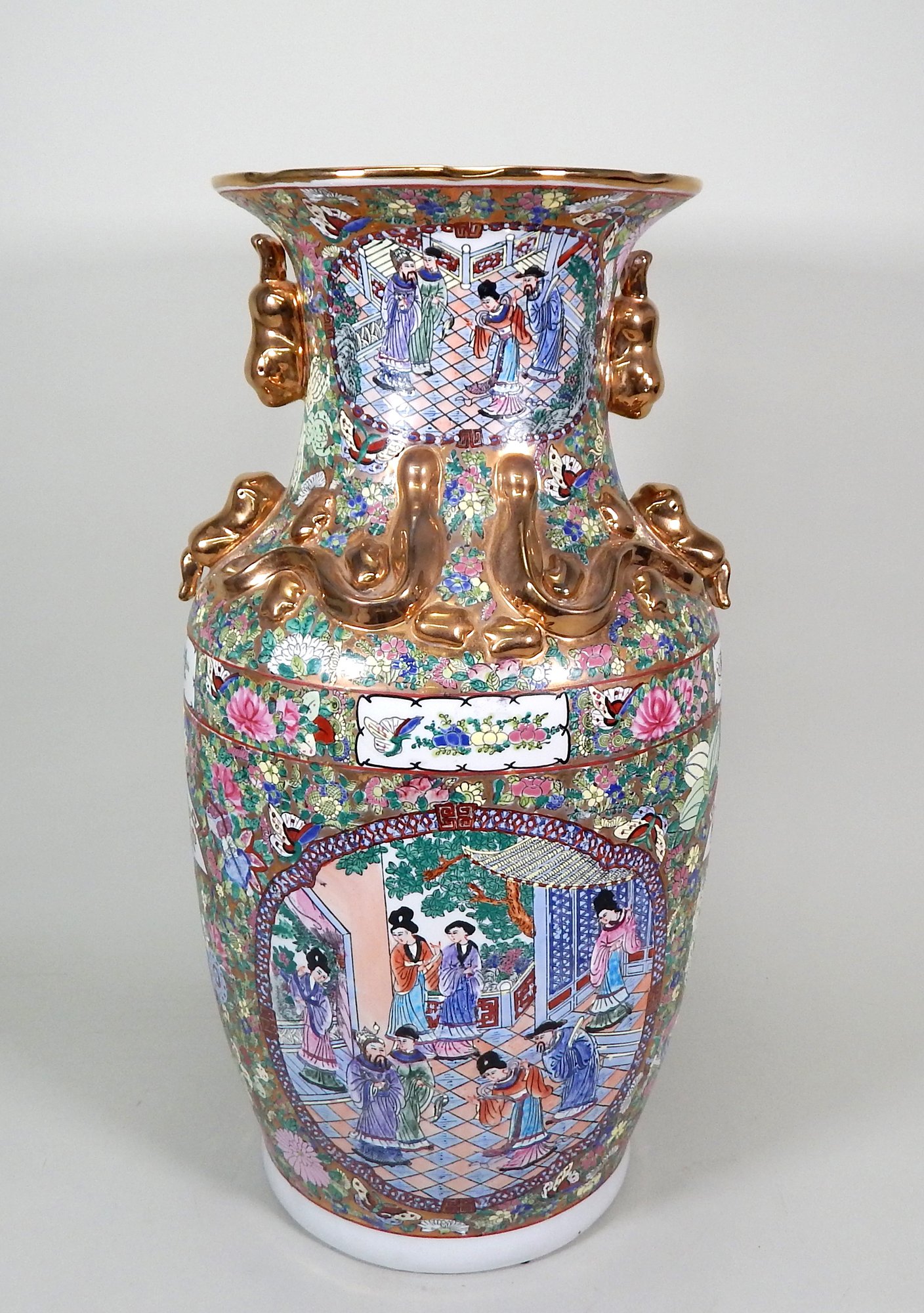 Beautiful tall vase with hand painted scenes, flowers and butterflies.