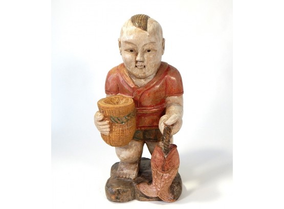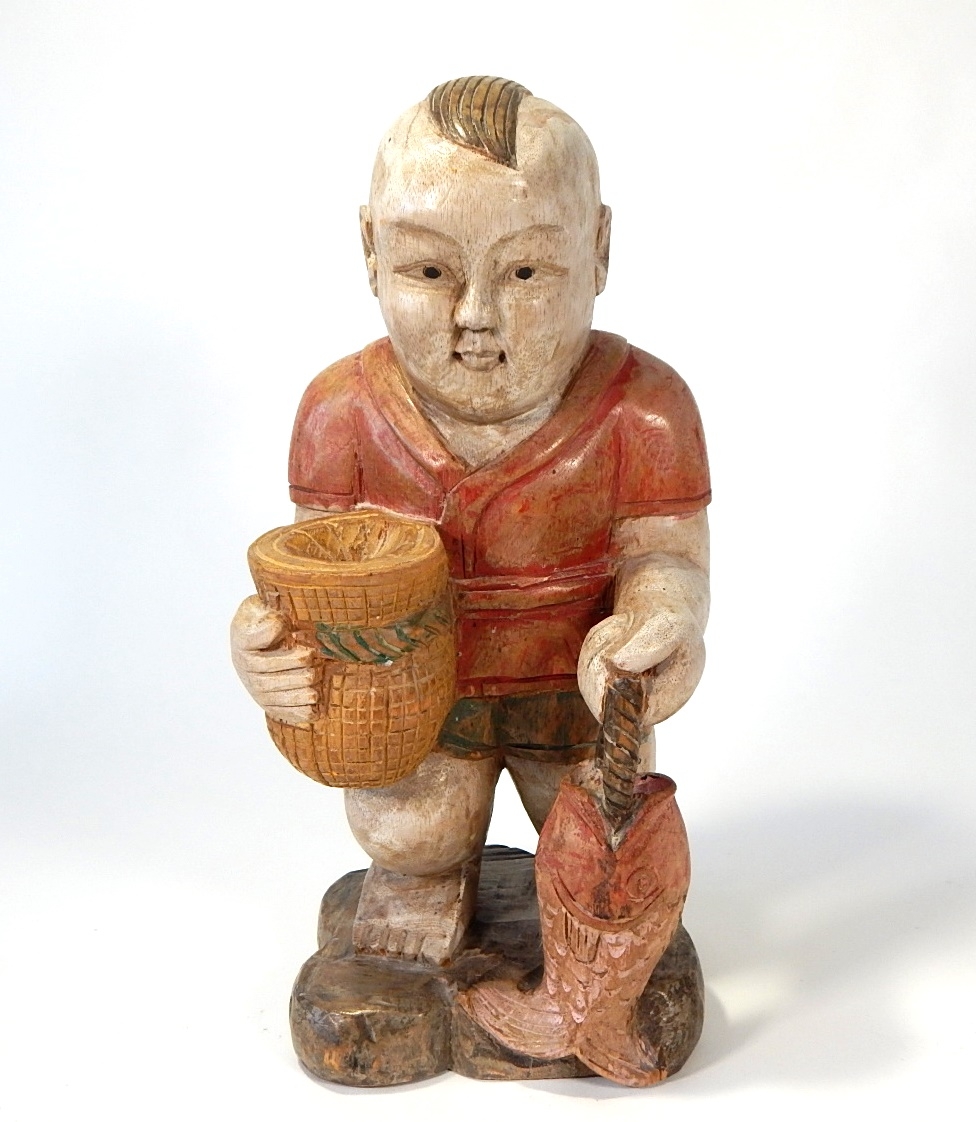 Hand carved and painted figure of man holding a fish.