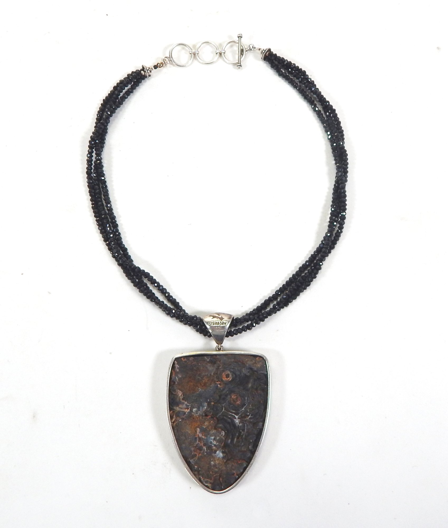 Large hallmarked sterling silver crazy lace agate shield shaped pendant with black spinel two strand necklace. Measures 12'(24") long, weight 93.3 grams.