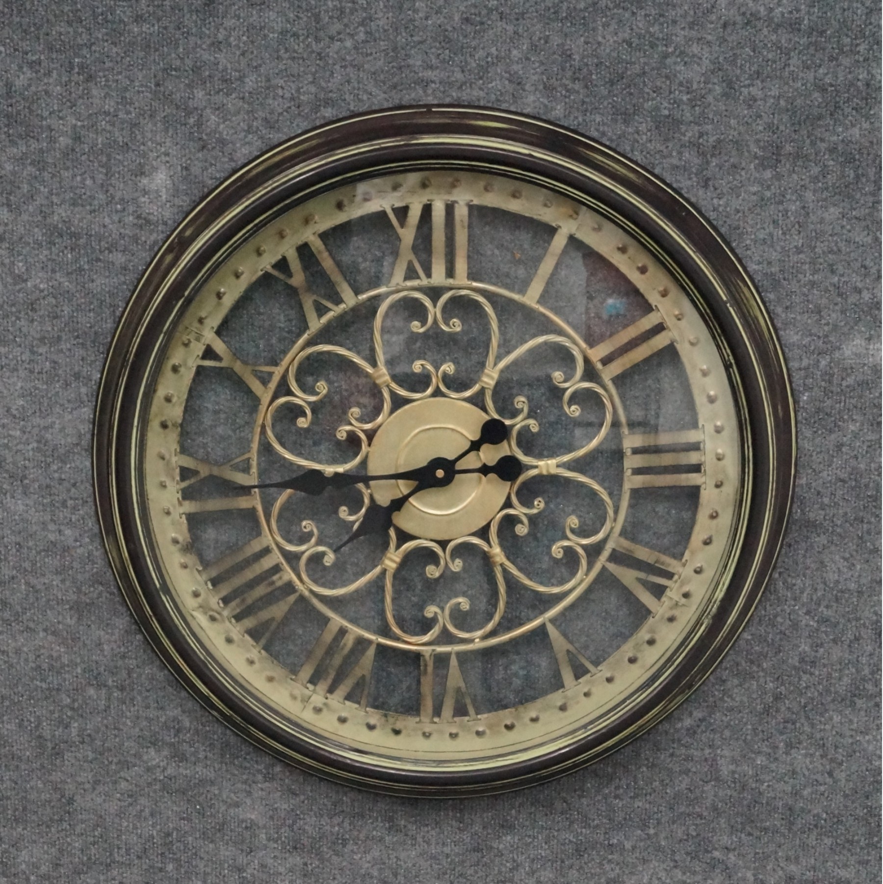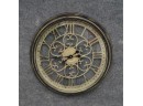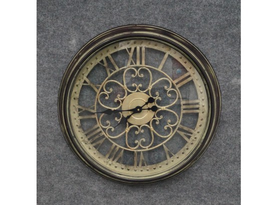 Listed is a large glass see-through wall clock with roman numerals. It has a sage green patina finish over espresso/black metal outer frame. Battery operated. It measures 25" in diameter.