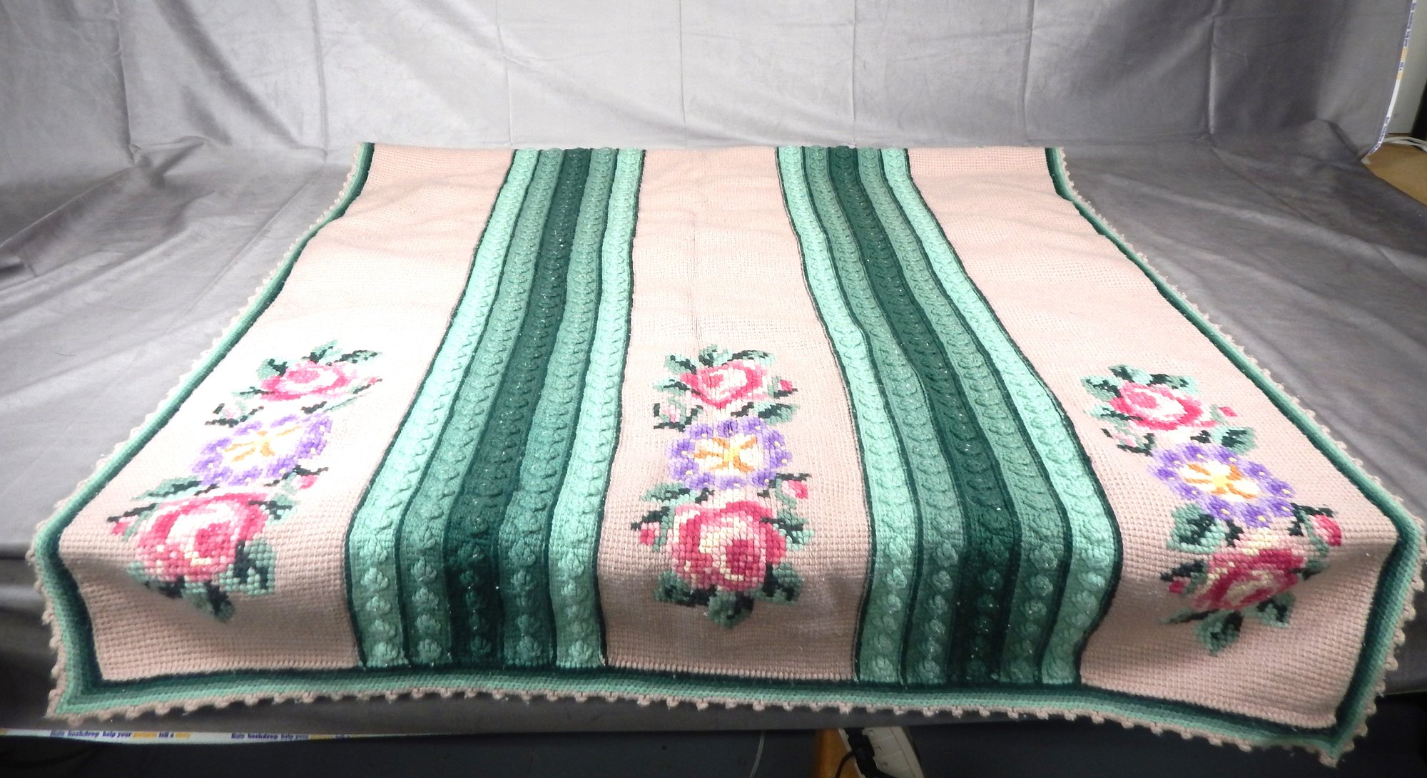 Wool knitted/crocheted throw measuring 45" x 60". A little pilling but in very good condition.