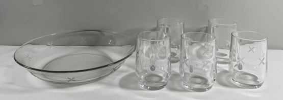 Set of five clear glass mugs with handles and a matching serving plate. Each piece is decorated with an etched floral design. Mugs measure approximately 4.25 x 4 inches. Plate measures approximately 2.25 x 11.25 inches.