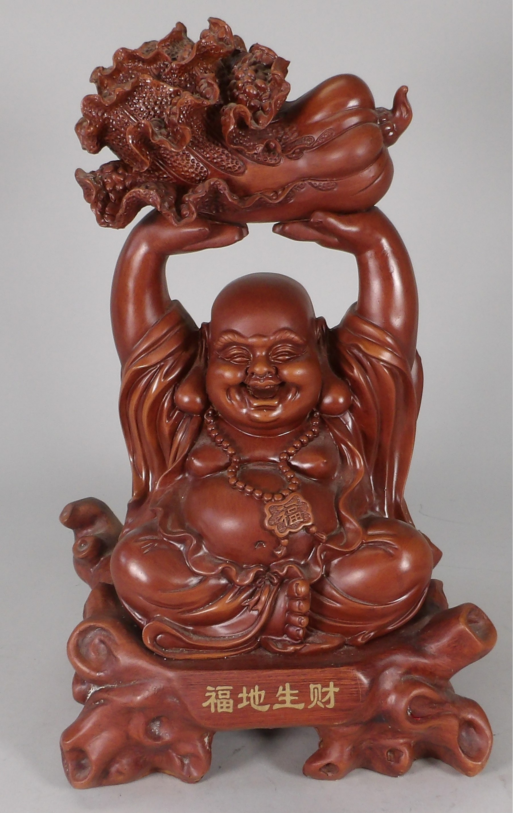 The laughing buddha is a symbol of joy, wealth, and prosperity. The statue stands 17" tall. I put the Coke can on the picture for scale. The writing on the front means, "Prosperity to make money". The statue is resin but looks like wood. Great piece!
