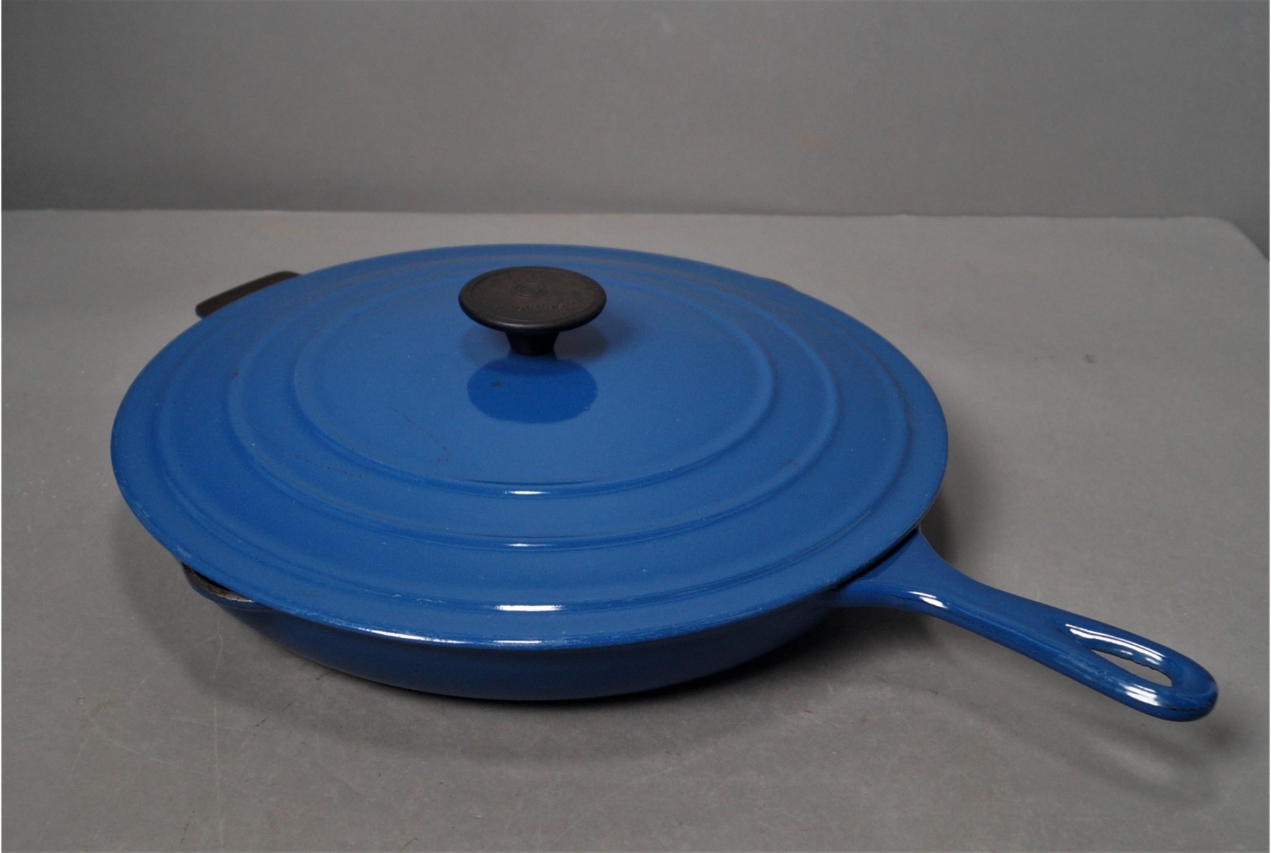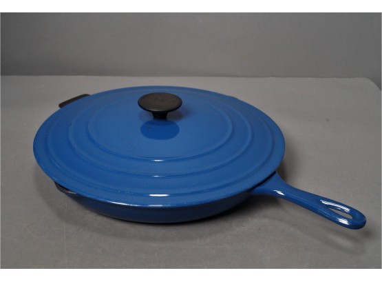 Listed is a Le Creuset 12" skillet with cover in blue enamel.