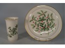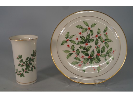 Lenox holiday China. Serving platter is 12 1/2" round. Vase is 7 1/2" tall, and 4 1/2" round. Made in the USA. 24kt gold trim. No chips, or cracks on either piece.