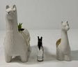 Set of three decorative llama figurines. Includes two ceramic llamas, one of which is a planter, and one glass llama. Largest measures approximately 6.75 x 5.5 inches.