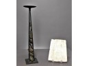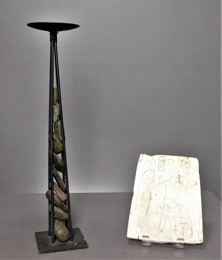 The pillar candle holder stands 18 inches tall. It is black metal, and filled with rocks. The plaque is 6 x 8. It is made of a chalky material, and is ready for hanging.