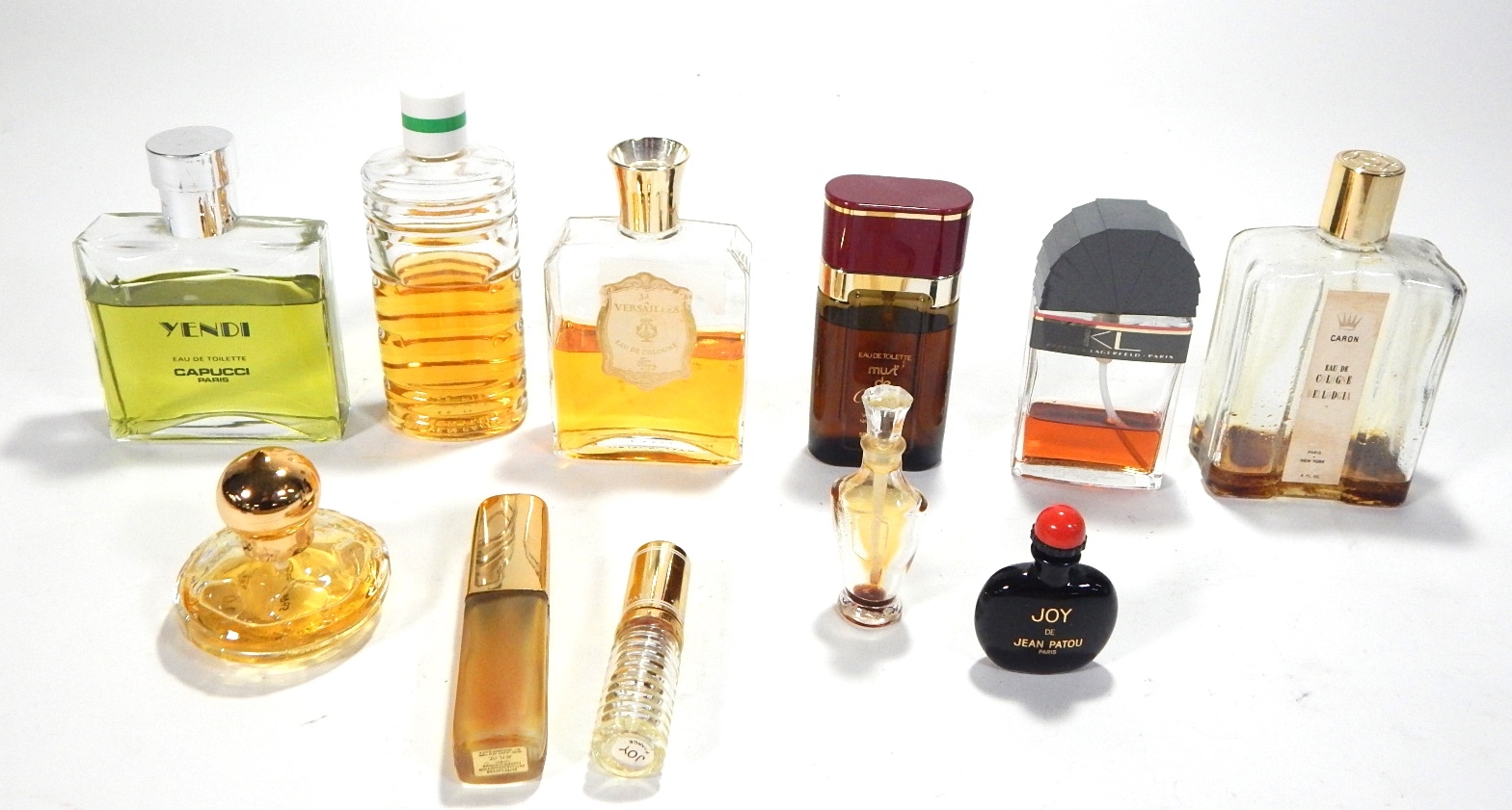 Lot of 11 vintage perfume bottles with some amount of perfume still in them.