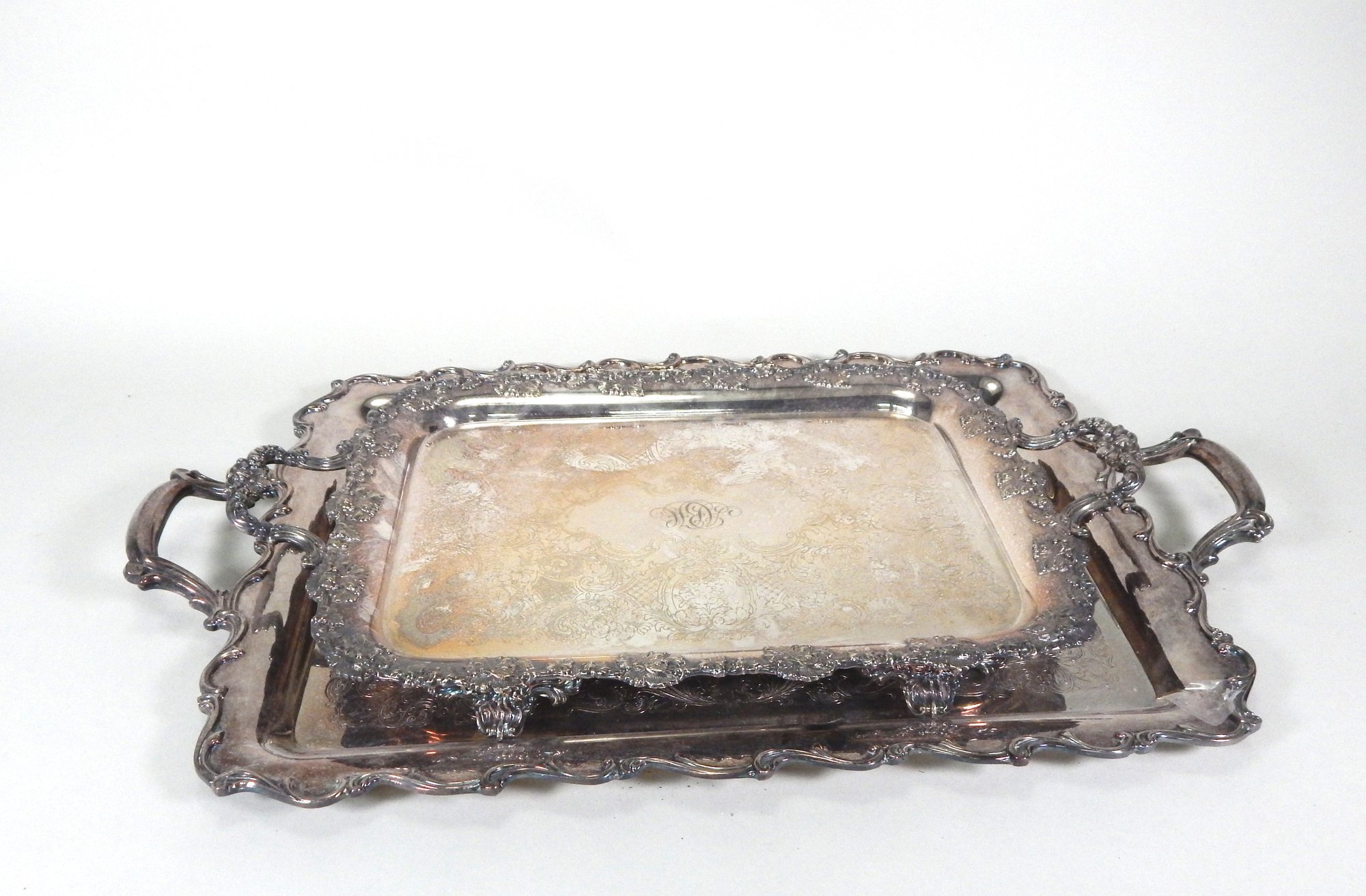 Two chased silverplate trays, one marked "Gorham".