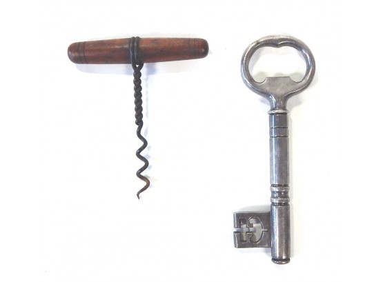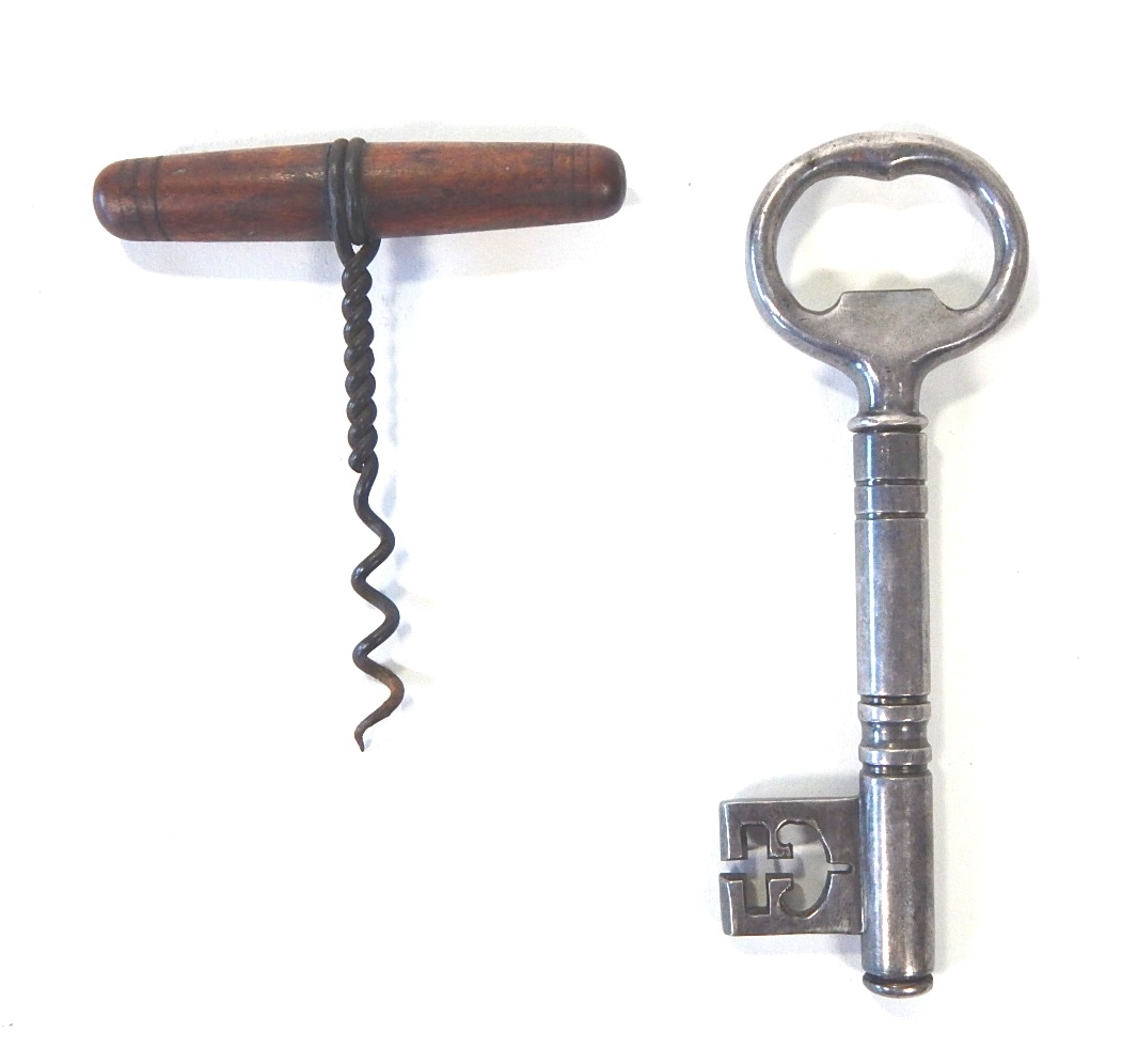 Two corkscrew bottle openers, one in the form of skeleton key.