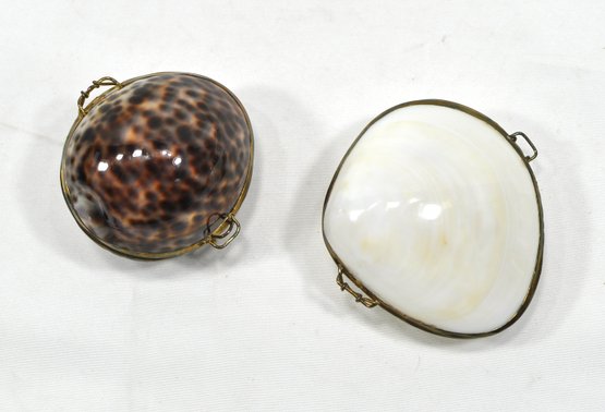 Genuine Bohemian brown and pearlized clam shell and brass hinged coin purse trinket boxes.
