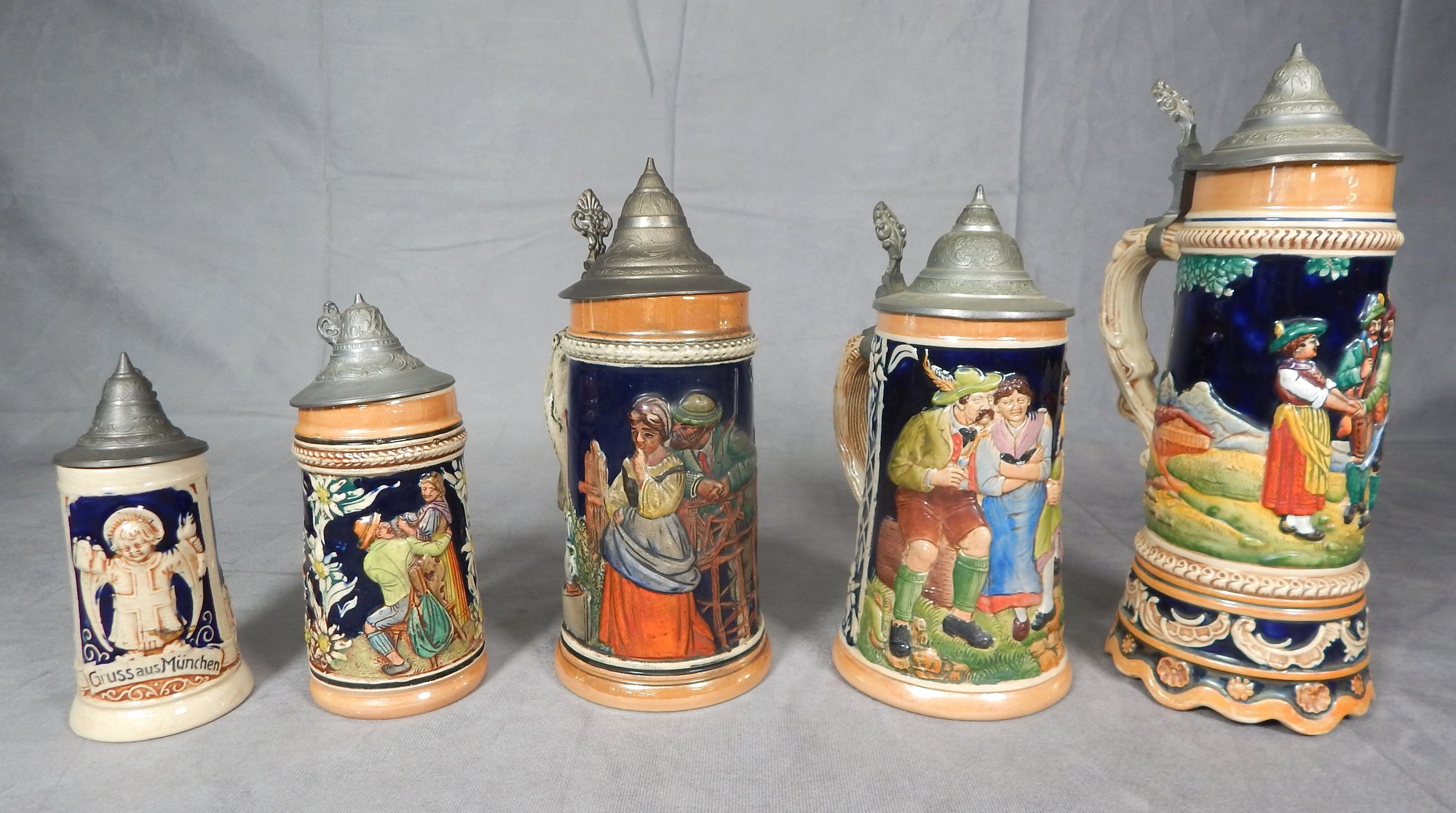 Smallest stein "Gruss aus Munchen" measures 6"tall and in VG condition.