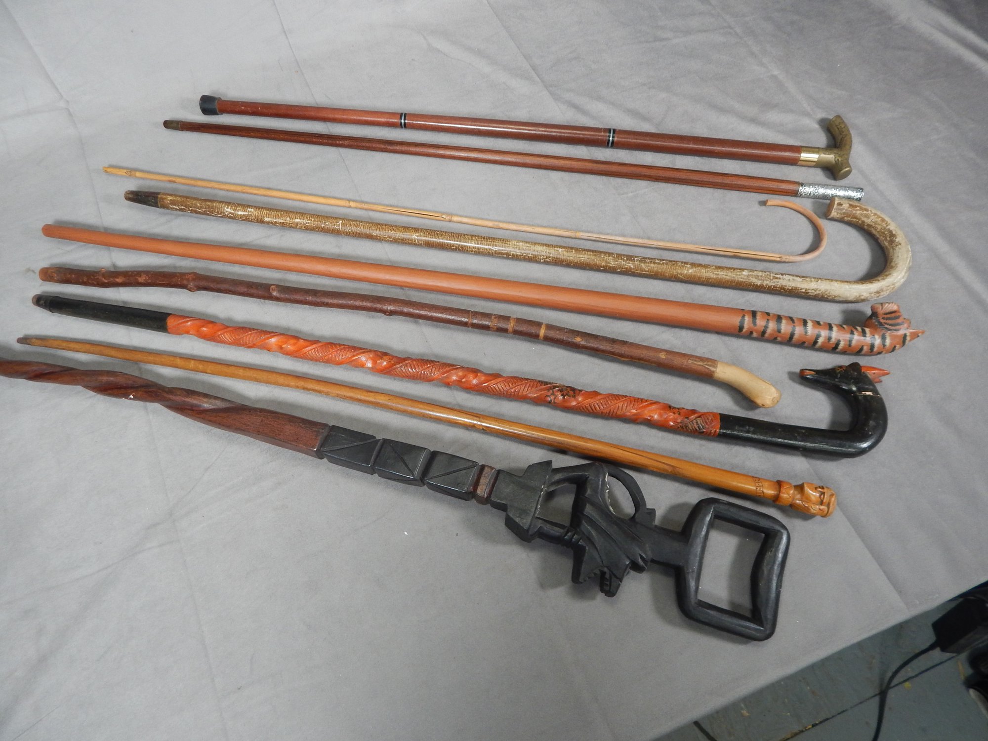 Variety of nine canes & walking sticks. Walking stick with sterling handle; cane with brass handle; a number of carved canes with animal motifs and more.