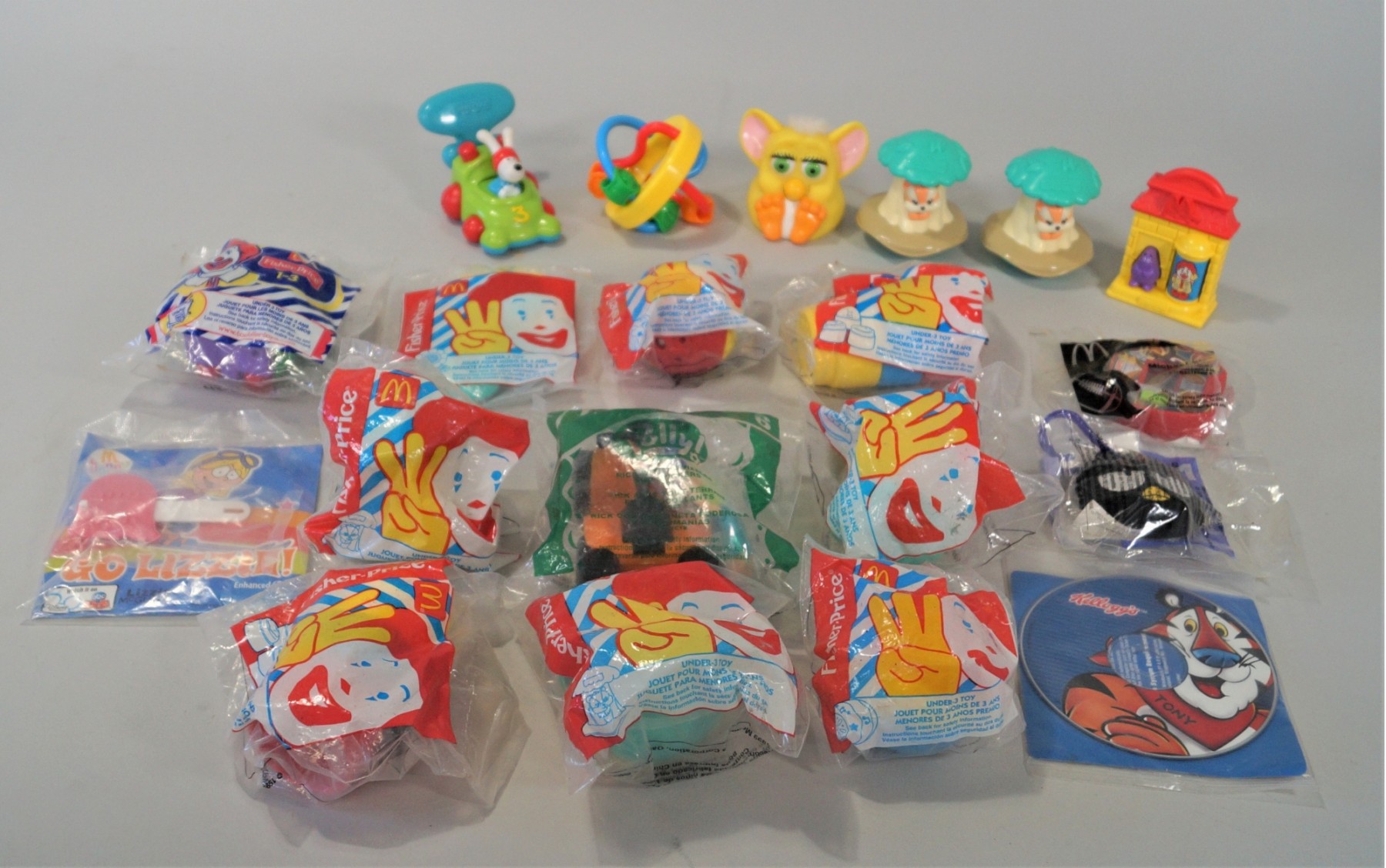 Listed is a lot of McDonald's toys, many in original plastic wrapping, dating from the 1990's. All of them are are Fisher Price toys. One random Tony the Tiger CD is part of the lot. Please see photos for details.