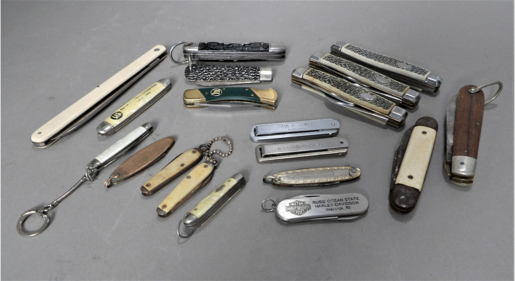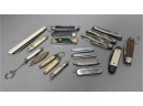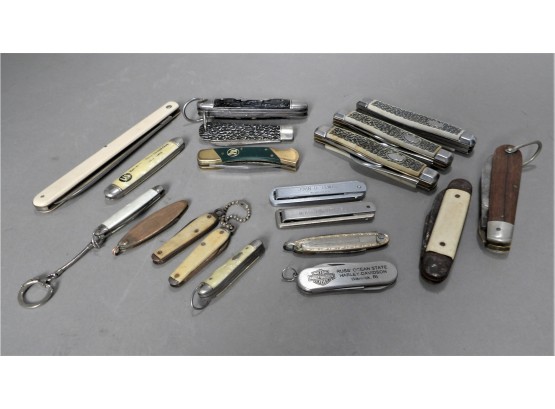 Listed are 19 pockets knives with names such as Ulster US 5 Stainless; Kamp-King; L K Co. USA. Condition is used. See photos for details.