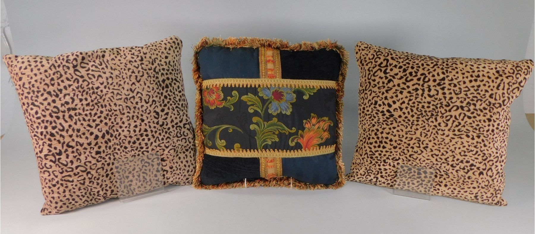2 animal print pillows are 18". Made in the USA by Newport. One pillow has a tear, as shown. All 3 have zippers.