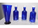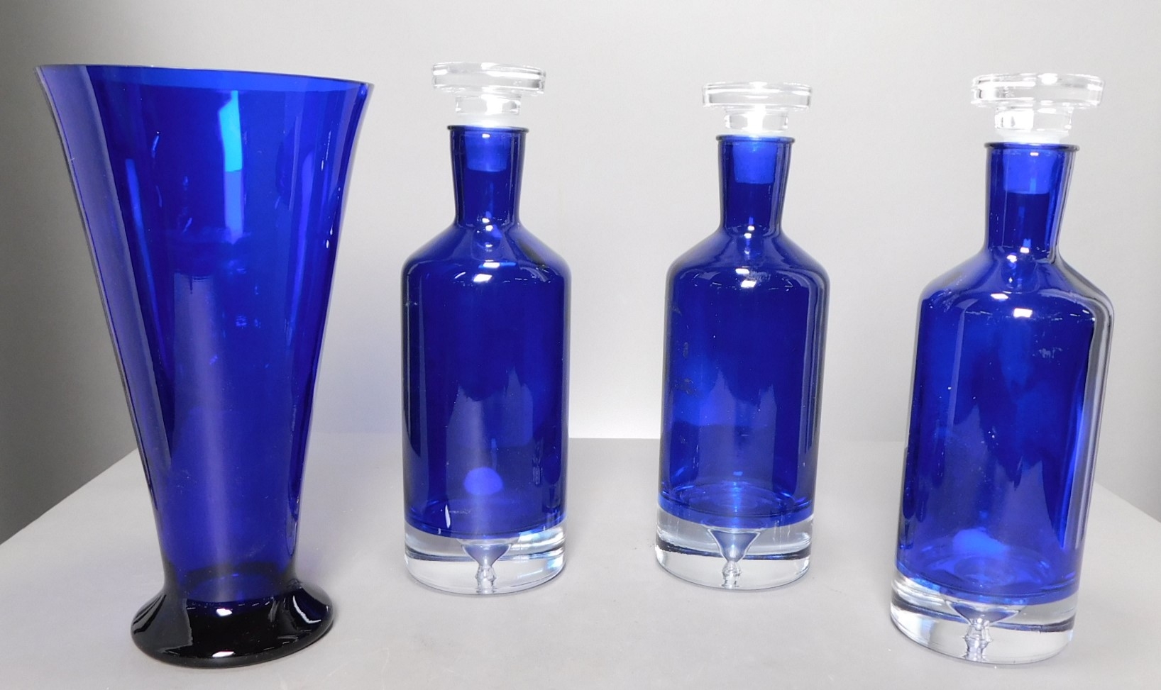 Vase is 11 inches tall. Carafes are heavy on the bottom. Tops included. Very nice, blue color.