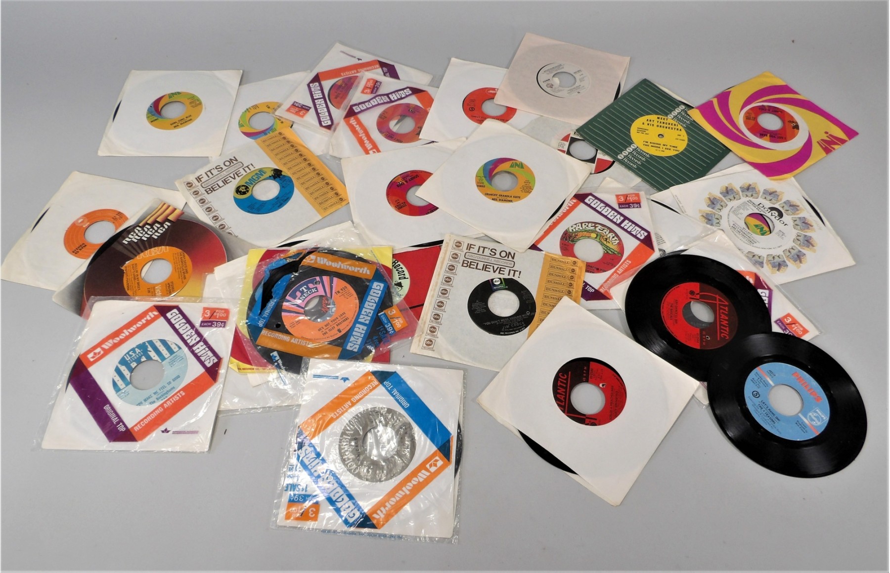 Listed is a lot of 45 RPM records. All but 2 or 3 are in their original jackets - some unopened. Most are from the 60's & 70"s. Condition is very good. See photos for details.