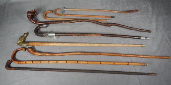 Variety of wood canes, walking sticks and a single horse crop with sterling handle. The long canes have an average length of 36". The small canes & the horse crop measure around 21" in length. The handle of one cane opens up to become a seat one can lean on as the pointed end is inserted in the grass. See photos for details.