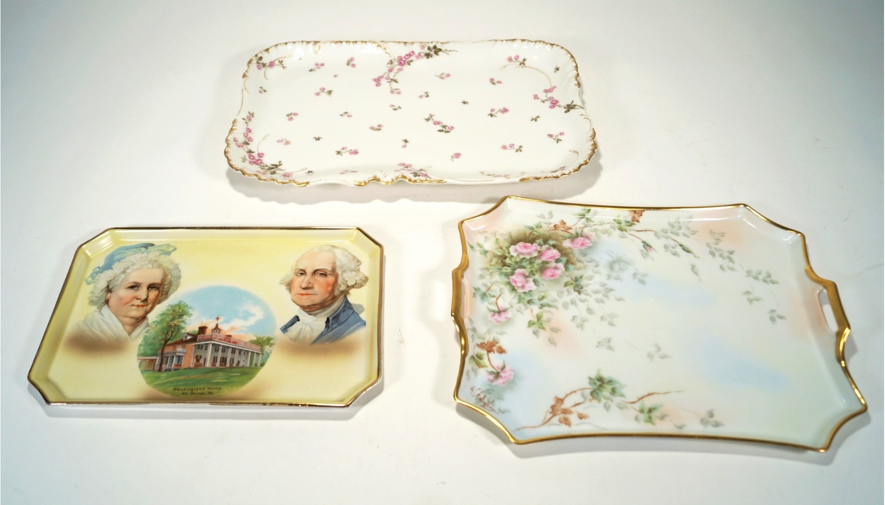Tray with pink flowers is 14 x 9, and made by Limoges. Gold rimmed tray with handles is marked Bavaria. Washington tray is made in Germany.